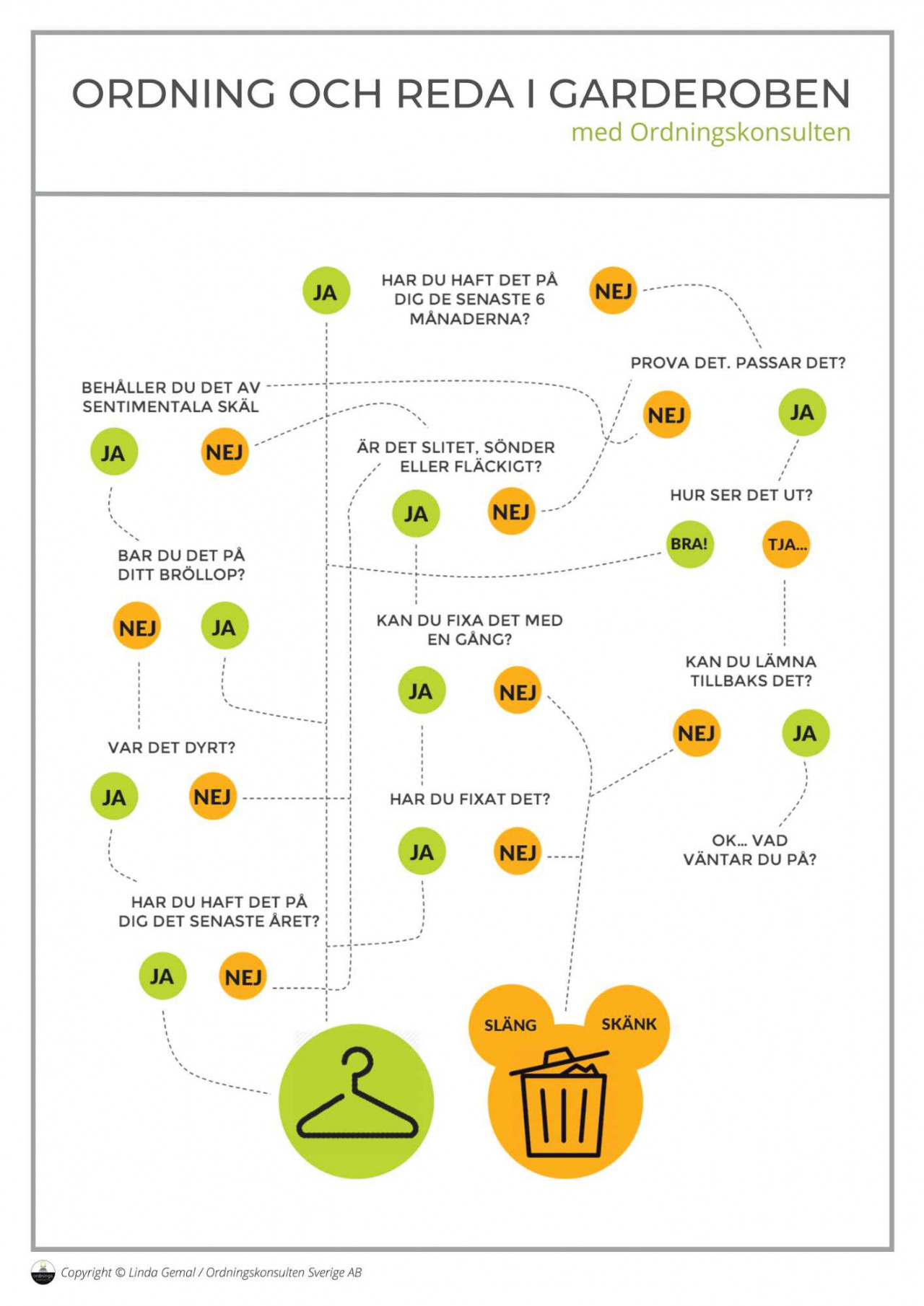Följ stegen. Ha lådor och påsar redo för skänka/sälja/återvinn/kasta.