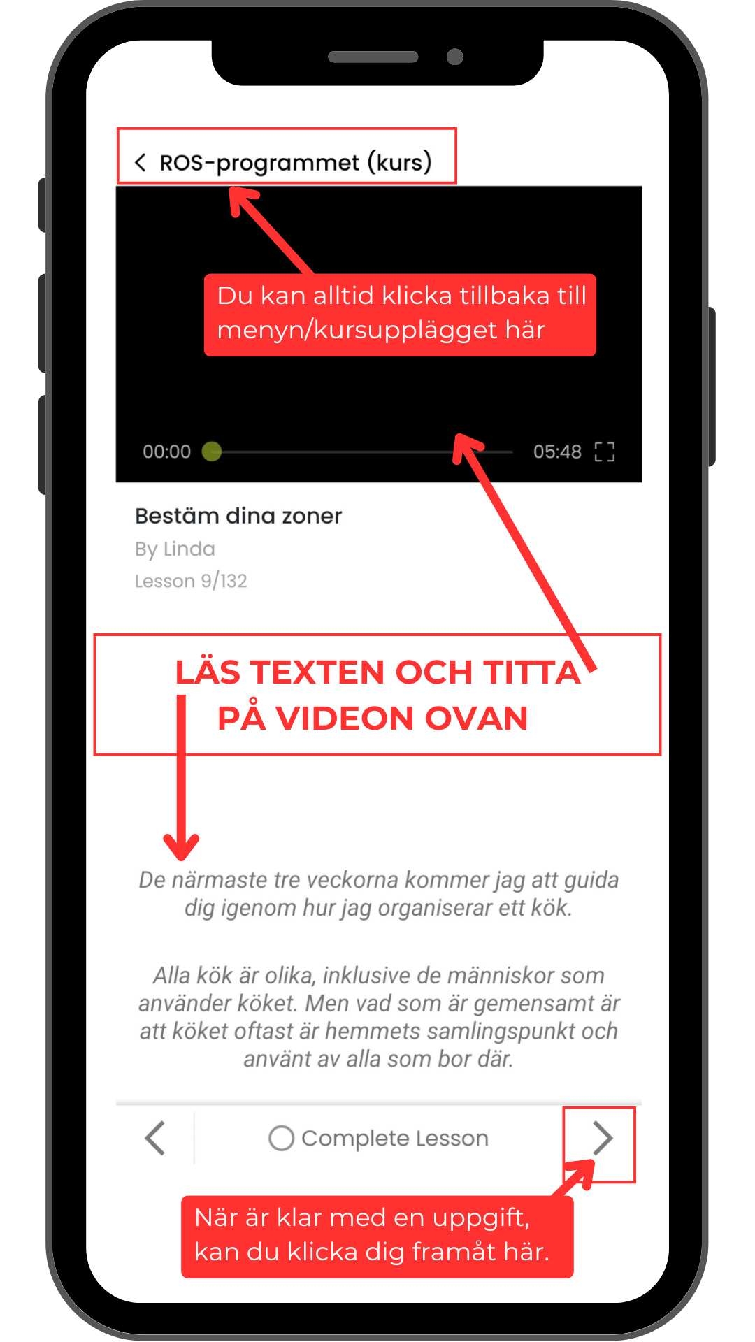 För varje ny uppgift finner du en sida med text och eventuell video.