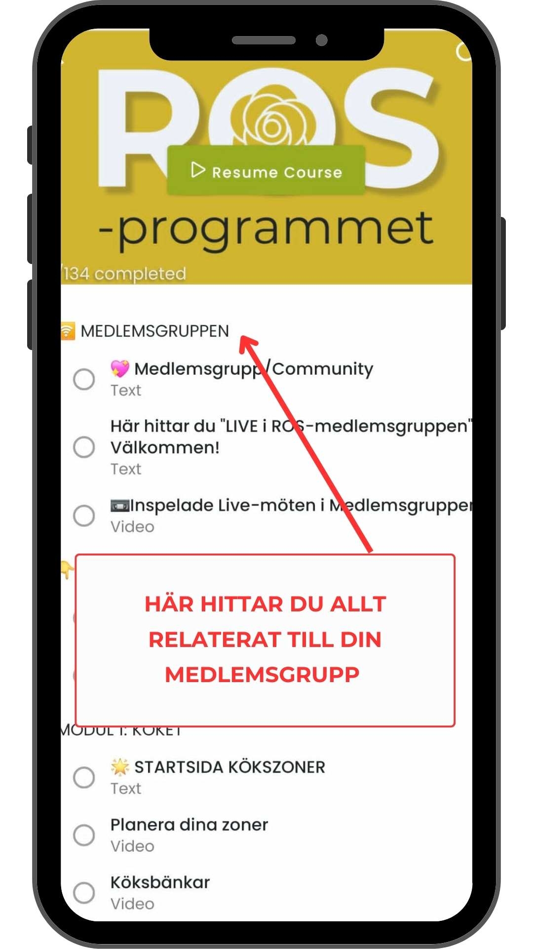 👉 Obs! Det är endast själva kursen och eventuell medlemsgrupp du kan se och använda i appen. Behöver du kika på eller ändra något i dina inställningar, gör du det online under Mitt Konto.